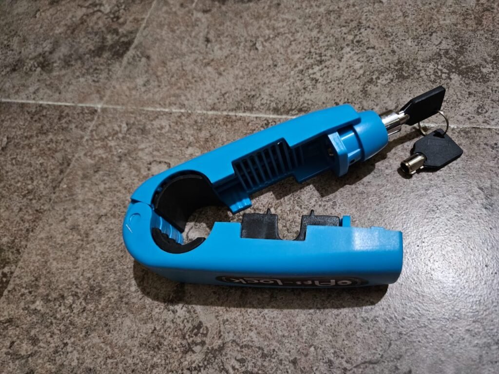 Lock your ride in seconds with the Krezcoo Brake Lock. Its strong construction and bright color act as a powerful deterrent, securing both the throttle and front brake against unauthorized use.